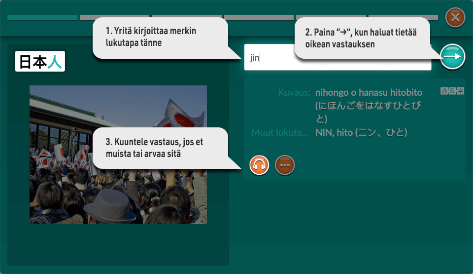 Taitojesi kehittyessä voit siirtyä omassa tahdissasi vastaamaan kokonaisin sanoin ja hiragana-merkein. Esimerkiksi kuvassa kaikki seuraavat vastaukset ovat oikein: jin, nihonjin, じん, にほんじん.
